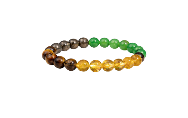 हा ब्रेसलेट वेगवेगळ्या नैसर्गिक क्रिस्टल्स (उदा., Pyrite, Citrine, Green Aventurine, Tiger’s Eye इ.) च्या संयोजनामुळे तयार केला जातो आणि त्यांचे पारंपरिक विश्वासानुसार हे फायदे सांगितले जातात: